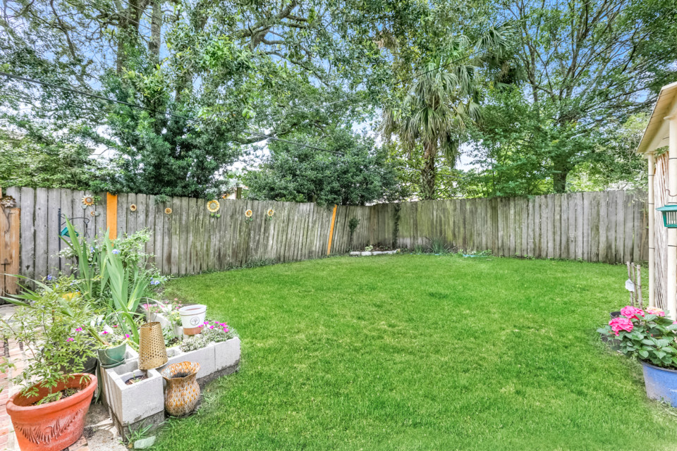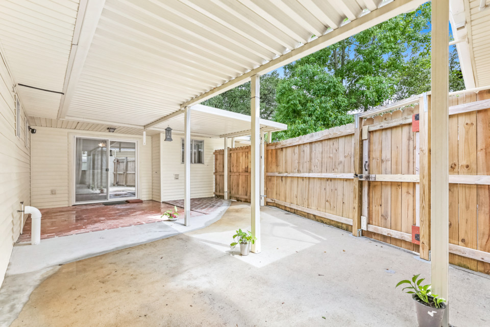 Sliders open to fenced back yard.
